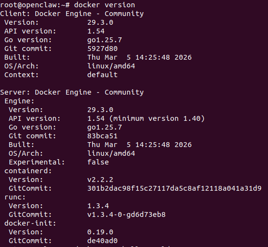 本次测试环境安装到的版本 docker-ce (5:29.3.0-1~ubuntu.24.04~noble) 时间戳202603162208