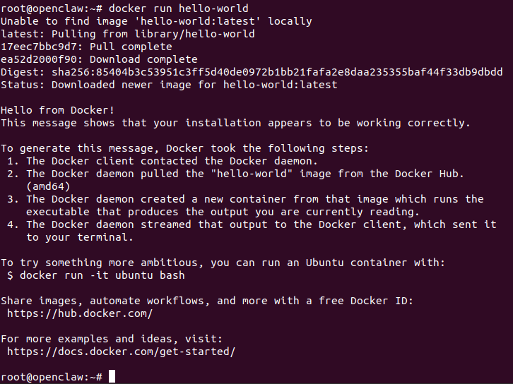 root@server# docker version root@server# docker run hello-world