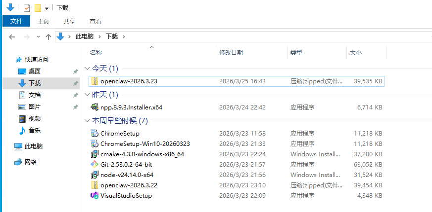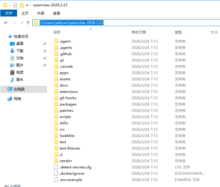 解压缩openclaw 的源代码的压缩包,我一般就直接放在我这个用户的目录下,这样Powershell页面中,初始位置就直接可以快速访问到。