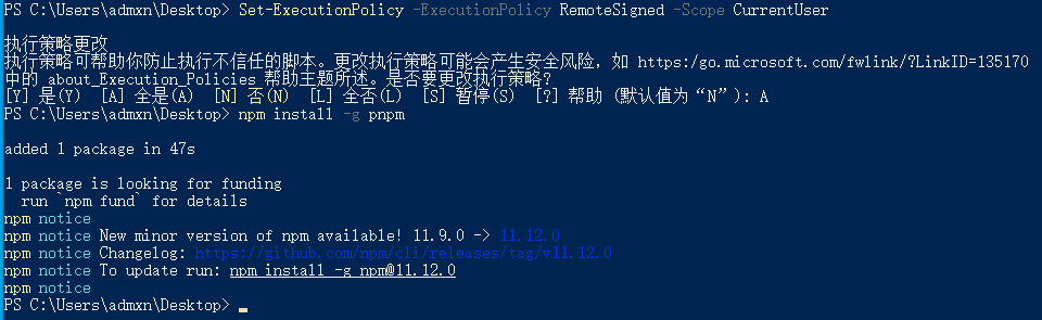// 执行策略限制的释放。 Set-ExecutionPolicy -ExecutionPolicy RemoteSigned -Scope CurrentUser 选择 A 回车 // 安装pnpm npm install -g pnpm npm install -g windows-build-tools // 检查版本 v10.33.0 pnpm -v