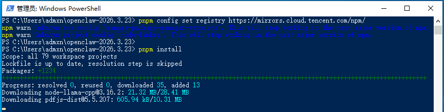 // 首先是设置国内的npm源 // 设置国内镜像源 腾讯 pnpm config set registry https://mirrors.cloud.tencent.com/npm/ // 或者 // 设置国内镜像源 淘宝 pnpm config set registry https://registry.npmmirror.com // 安装依赖,本次更新发现有1234个包,需要比较久的下载和添加时间。 pnpm install