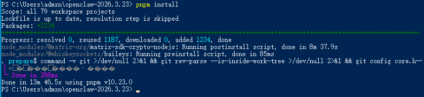 // 构建 UI 与核心,需要进git bash 且为管理员,执行如下的命令 cd C: cd Users/admxn/openclaw-2026.3.23 pnpm ui:build pnpm build pnpm setup // 全局目录配置 pnpm link --global // 启动初始化openclaw openclaw onboard --install-daemon